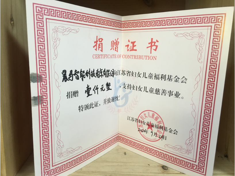 2019年9月24日,晨馬智能科技南京有限公司向江蘇省婦女兒童福利基金會進(jìn)行愛心捐贈,并獲頒捐贈證書。成晨馬智能一直熱心于社會公益事業(yè)發(fā)展,勇?lián)鐣?zé)任!
