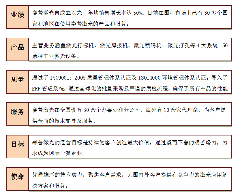 3. 光束質量佳,基模(TEMOO)輸出,聚焦光斑直徑10um,發(fā)散角是半導體泵浦 浦激光器的1/4,特別適用于精密、精細打標;