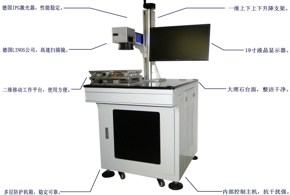 8. 配備德國原產(chǎn)高速掃描振鏡,體積小,緊湊堅實,定位精度高,動力卓越,加工速度是傳統(tǒng)激光打標機的2-3倍;